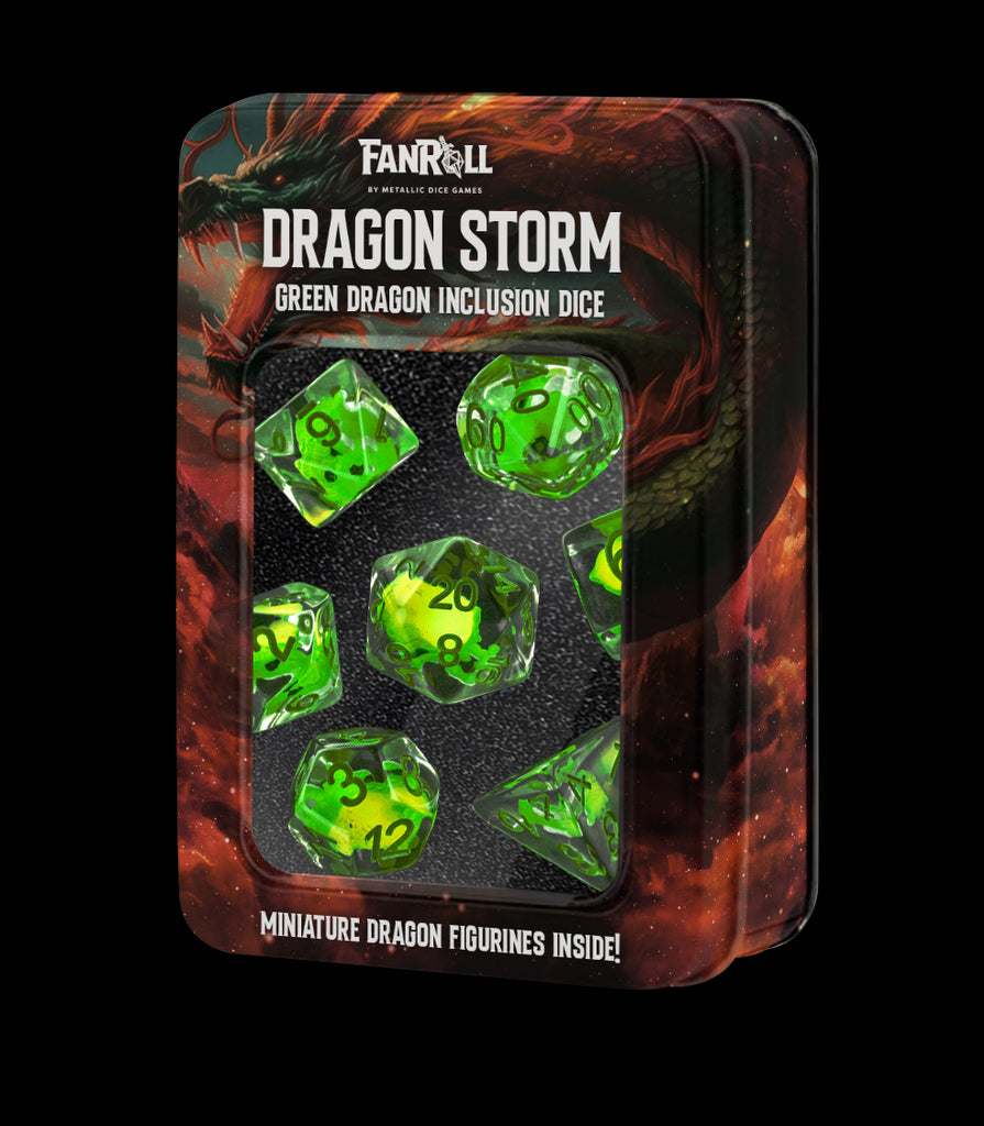 Dragon Storm inclusion dice feature the head of a dragon perfectly captured in each die. Each full-sized, 16mm resin set comes with 7 dice (d4, d6, d8, d10, d10% (00-90), d12, and d20).