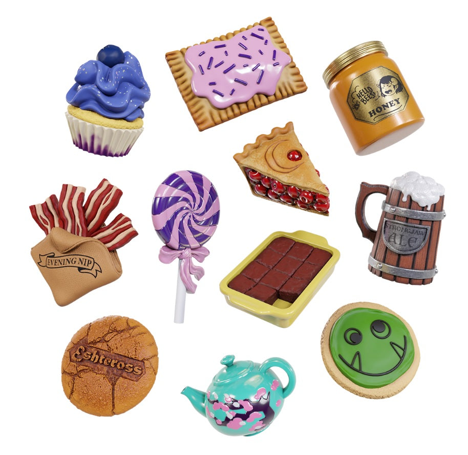 The Critical Role: Taste of Exandria Charms Countertop Display contains 11 unique charm designs depicting food items from the world of Exandria, including tasty treats inspired by all three of Critical Role`s main campaigns. Each CDU contains 24 blind foil packs (MSRP $4.99) and each charm is approximately 1.5-2". Collect all 11 designs!- Cherry Pie- Tusktooth Cookie- Scanlan`s Hand Pie- Maple Ginger Cookie- Jester`s Lollipop- Hello Bees Honey- Blueberry Cupcake- Caduceus`s Teapot- Pocket Bacon- FCG Baking Sheet- Strongjaw Ale Tankard. Images not final. Keychains are included, not shown in images. Note: Taste of Exandria Charms are not edible (no matter how cute they may look!